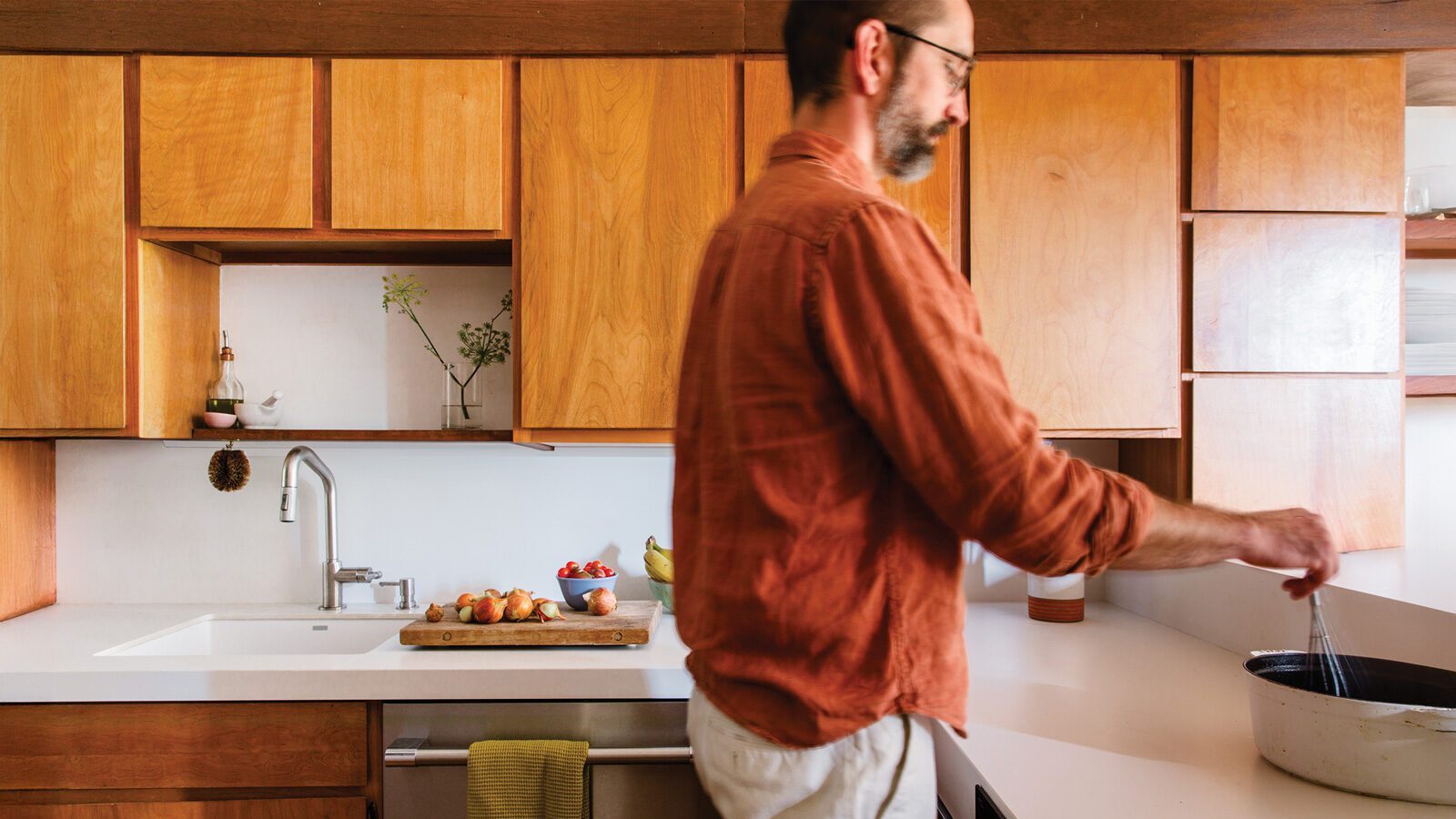 It was the narcotic effect of the home’s custom-built-on-site windows that sealed the deal. They featured butt-joint glazing, a glass-on-class mitering technique that allows a seamless panoramic view. Modern energy codes prevent the method from being used in new construction. The good news was that the home was purchased from Stricker’s son and, unlike the other three units, had retained many of its original mid-century details. The bad news was that the tiny kitchen retained some of the Space Age’s less critical contributions to culinary science, such as lazy Susan technology and clinically obese appliances.