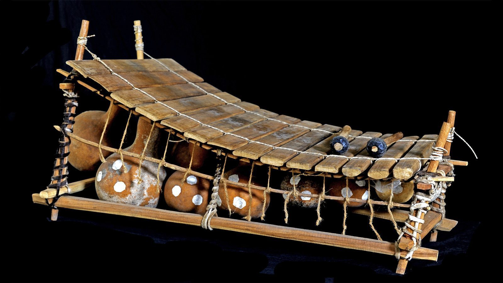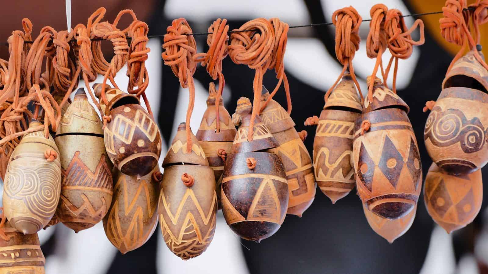 Historically, gourds have been multi-purpose powerhouses — people use them for everything from bowls and utensils to musical instruments. We carve, burn, paint, and weave gourds into everything from bowls to sculptures. Almost every culture has musical instruments made of gourds! In West Africa, they’re used to make the balafon, a xylophone-like instrument where hollowed-out gourds amplify the sound. There’s also the Mbira, or kalimba, a thumb piano made from a gourd with metal tines attached. Players pluck the tines with their thumbs to create soft, melodic tones.