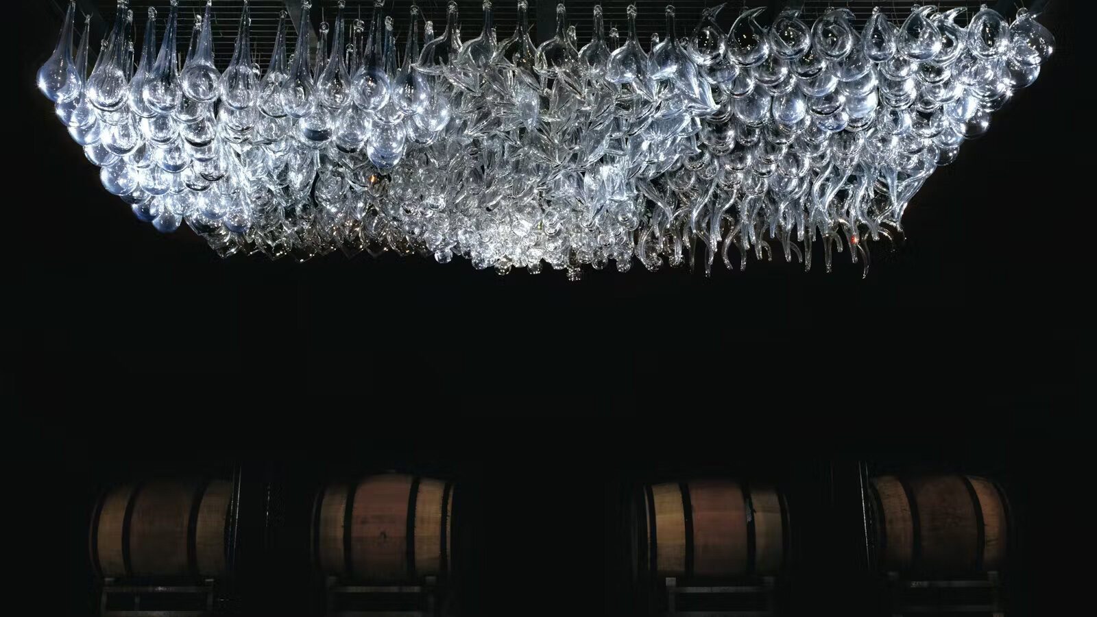 Suspended from the ceiling of the wine vault are blown glass decanters in six different forms. The artist Chen Zhen designed the sculptural vessels to suggest the internal organs of the human body.